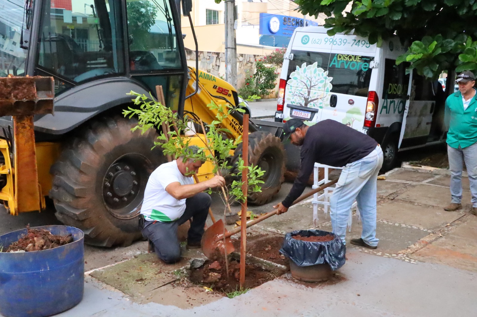 Na prática, o servidor chega para o plantio com todo o equipamento, que conta até com serra mármore, ferramenta utilizada no corte do concreto, para retirar o calçamento onde a árvore será plantada.