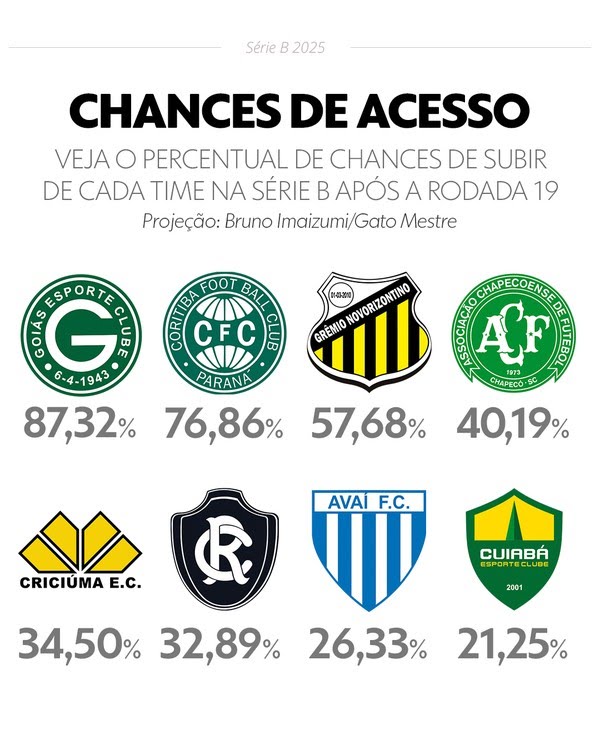 Além do Goiás e Coritiba, completam o G-4 e os favoritos ao acesso o Novorizontino (57,68%) e a Chapecoense (40,19%). Os dados foram obtidos com base em 10 mil simulações por partida, realizadas em parceria com o economista Bruno Imaizumi, e devem seguir mudando rodada a rodada até o fim da competição.