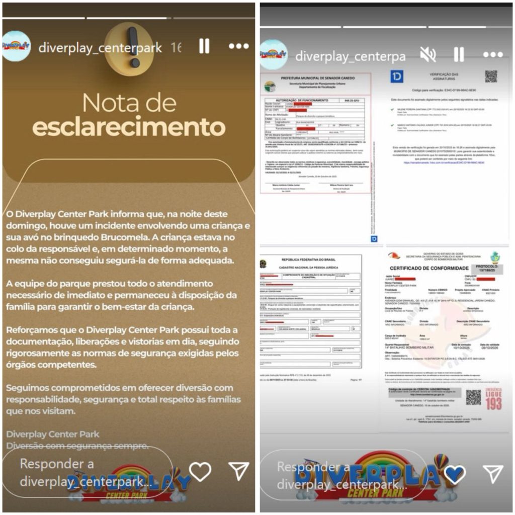 Um vídeo compartilhado por visitantes mostra o momento após o incidente, com o brinquedo parado e funcionários prestando atendimento no local.