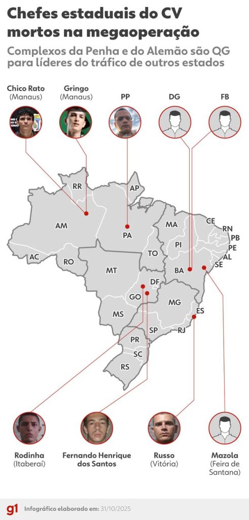 Dois criminosos apontados como chefes do tráfico de drogas em Goiás — Marcos Vinicius da Silva Lima, conhecido como Rodinha, de 27 anos, e Fernando Henrique dos Santos, de 29 — estão entre os mortos da megaoperação policial realizada nos complexos da Penha e do Alemão, no Rio de Janeiro. A informação foi confirmada pelo secretário de Polícia Civil do estado, Felipe Curi, durante coletiva nesta sexta-feira (31).