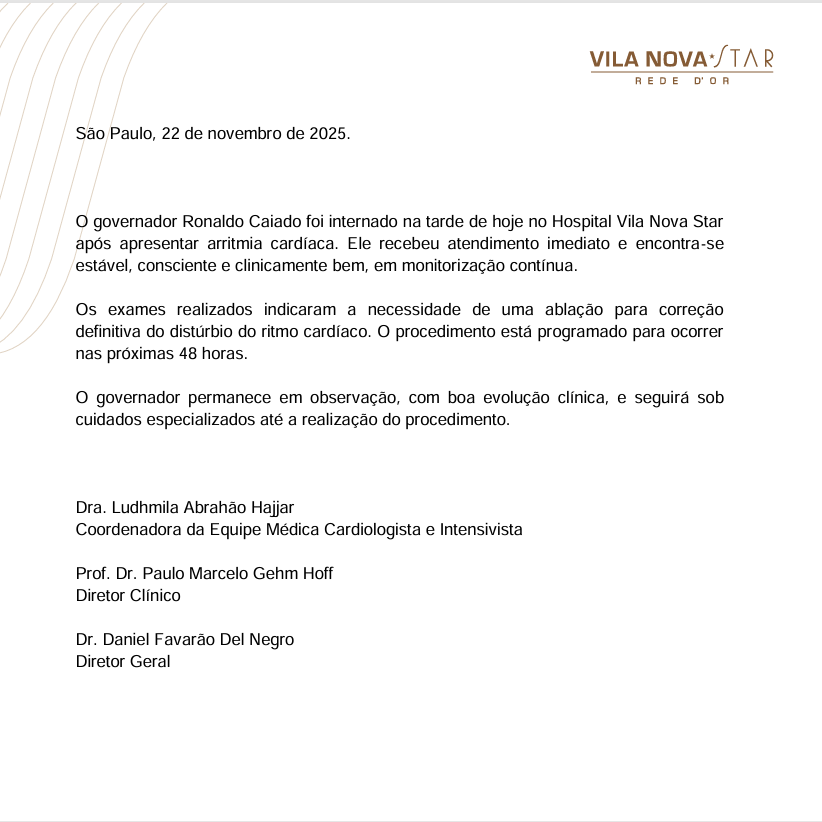 Governador recebe cuidados no Hospital Vila Nova Star, encontra-se consciente e com boa evolução, enquanto se prepara para o procedimento nas próximas horas