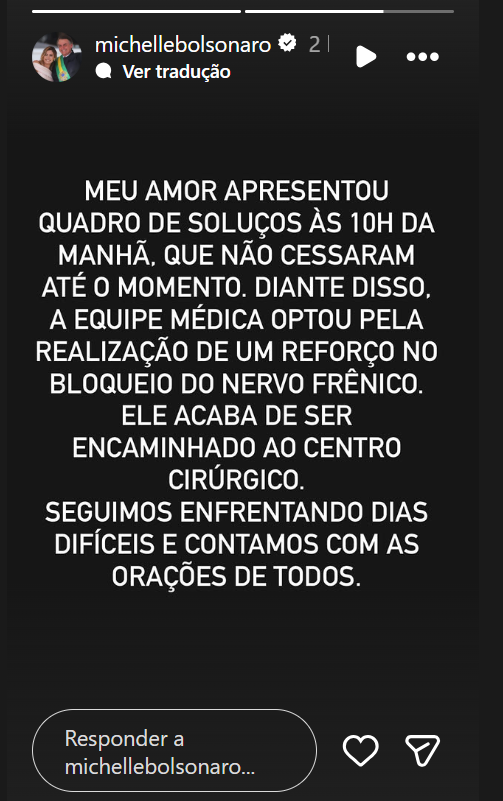 De acordo com Michelle, o episódio teve início por volta das 10h da manhã e não havia cessado até a decisão médica pela realização de um novo procedimento. Diante da persistência dos sintomas, a equipe responsável optou por reforçar o bloqueio do nervo frênico, técnica indicada para conter movimentos involuntários do diafragma.