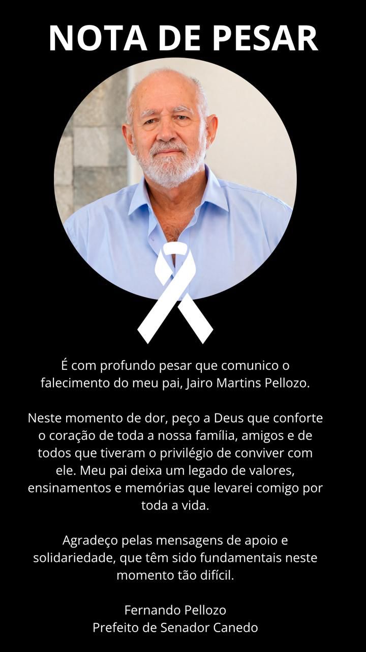 A cidade de Senador Canedo amanheceu em luto após o prefeito Fernando Pellozo comunicar, pelas redes sociais, o falecimento de seu pai, Jairo Martins Pellozo, ocorrido no sábado (4).