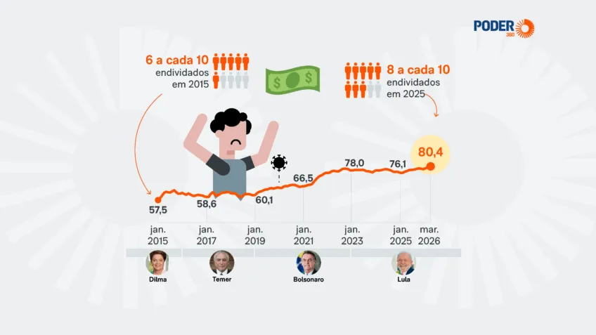 O endividamento das famílias brasileiras subiu 0,2 p.p. (pontos percentuais) em março e atingiu o maior nível da série histórica, iniciada em 2015. A taxa subiu de 80,2% em fevereiro para 80,4% em março.
