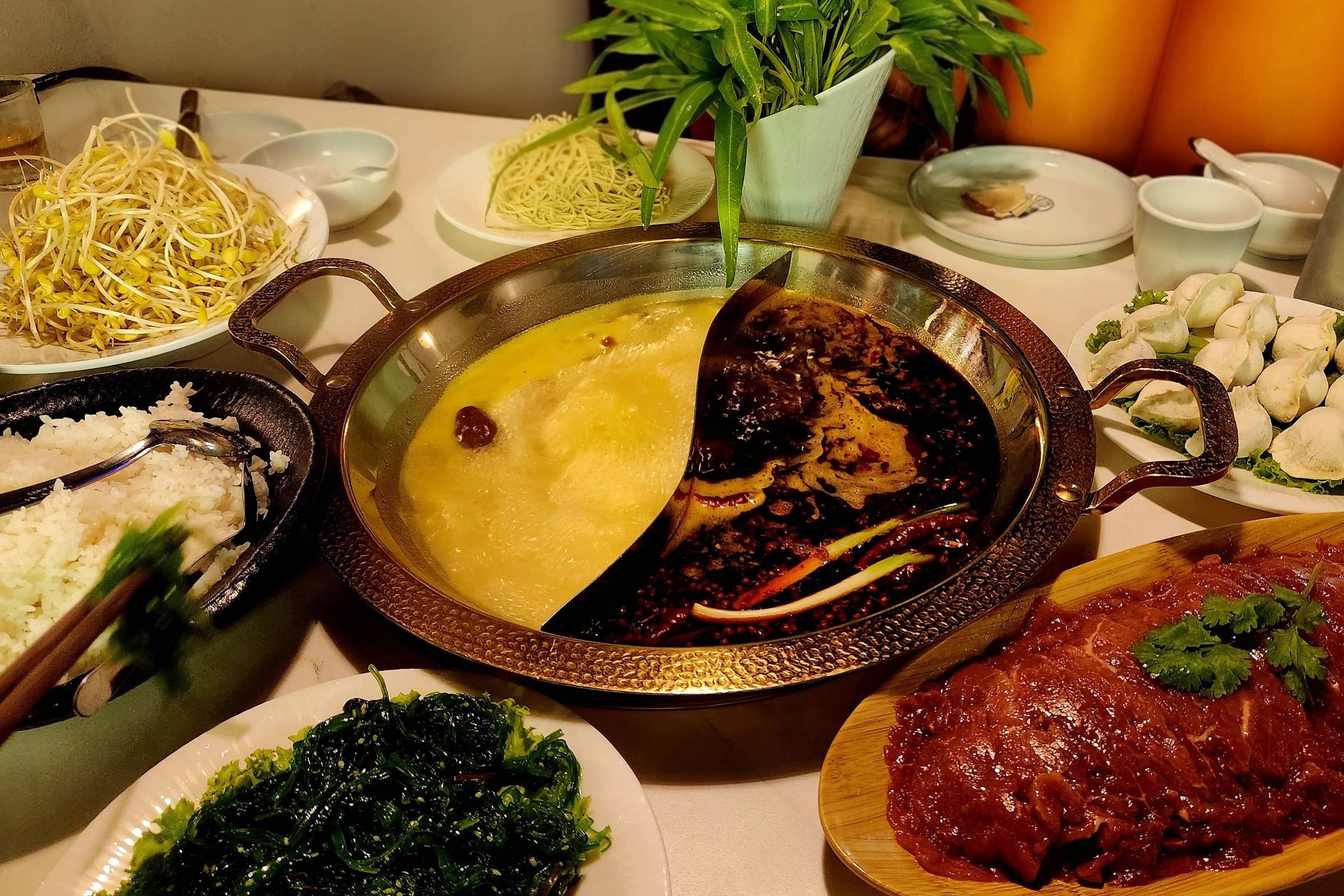 Mesa com panela de hot pot dividida em dois sabores, um claro e outro escuro, cercada por pratos com broto de feijão, macarrão, folhas verdes, bolinhos e carne assada.