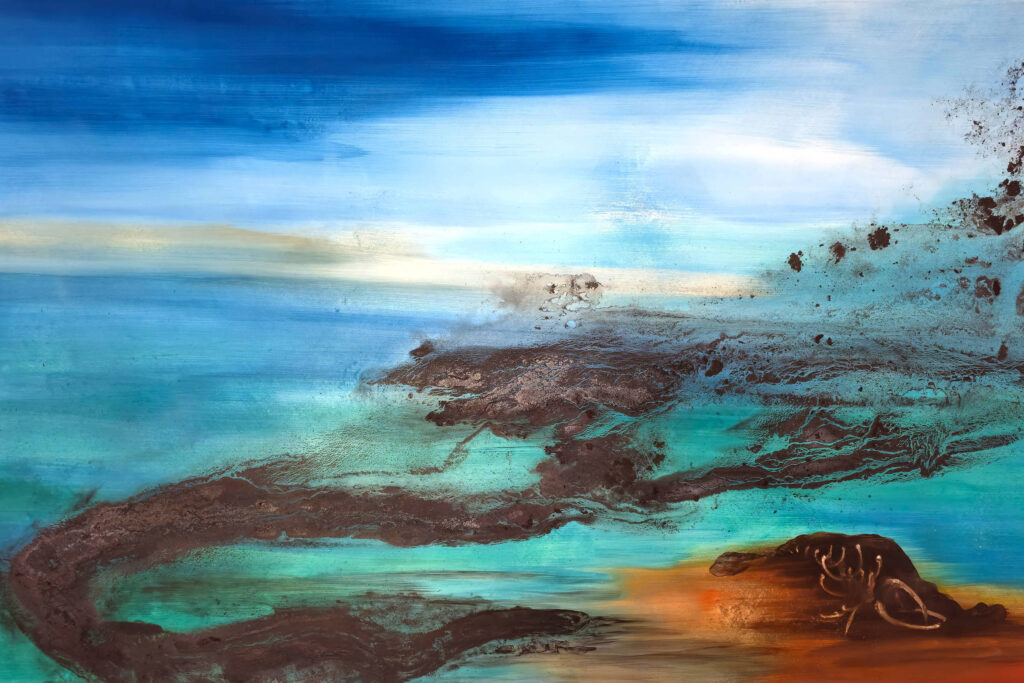 Além do questionamento existencial, Pitta faz comentários relativos às mudanças climáticas Em “Os Espíritos do Óleo”, delicadas manchas pretas se misturam a um turquesa límpido que lembra o mar. É uma imagem que, na vida real, lembra os vazamentos de navios petroleiros.