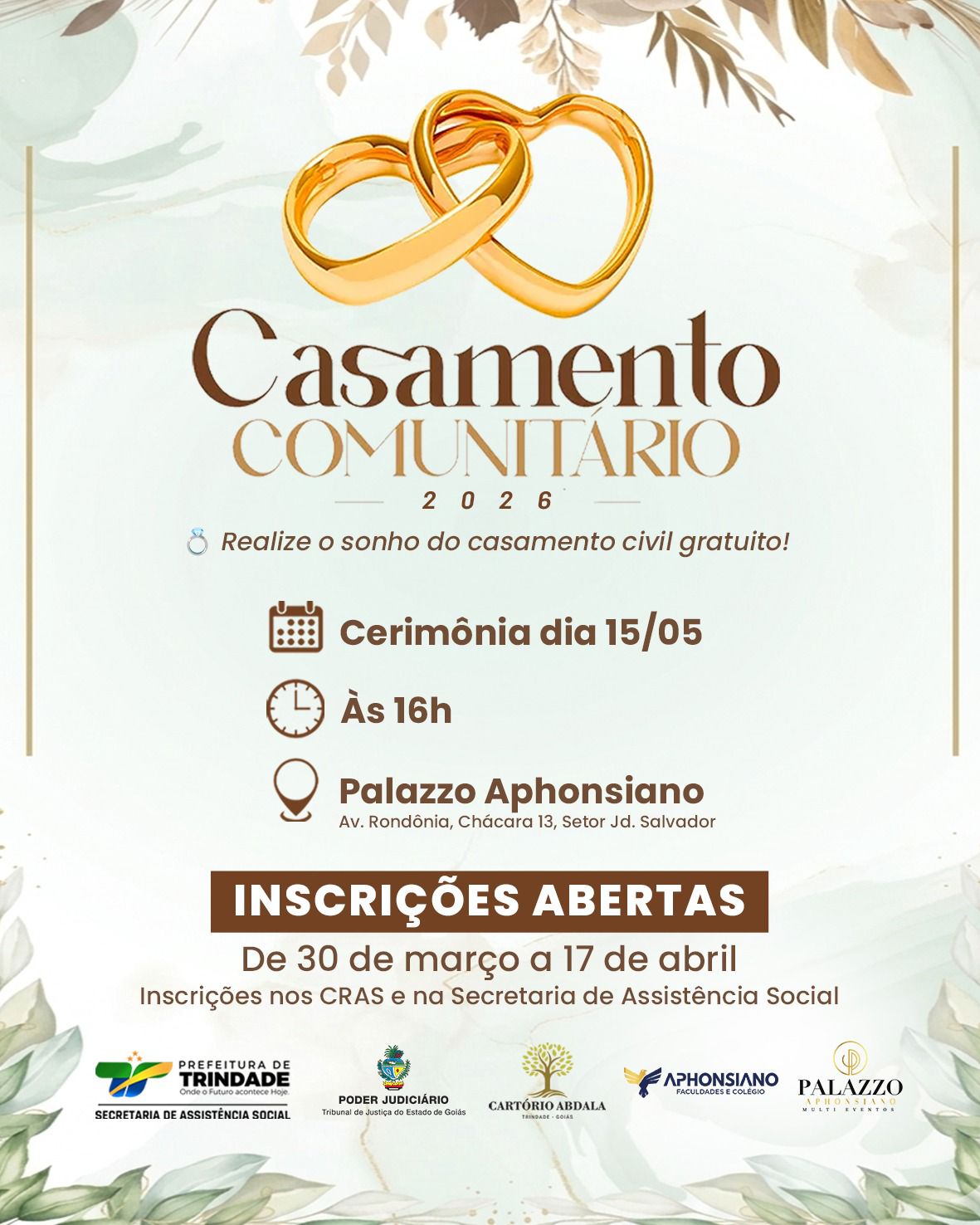 A Prefeitura de Trindade promove, no dia 15 de maio, mais uma edição do Casamento Comunitário, iniciativa que tem como objetivo oficializar gratuitamente a união de casais do município, fortalecendo famílias e garantindo dignidade por meio do acesso ao registro civil.