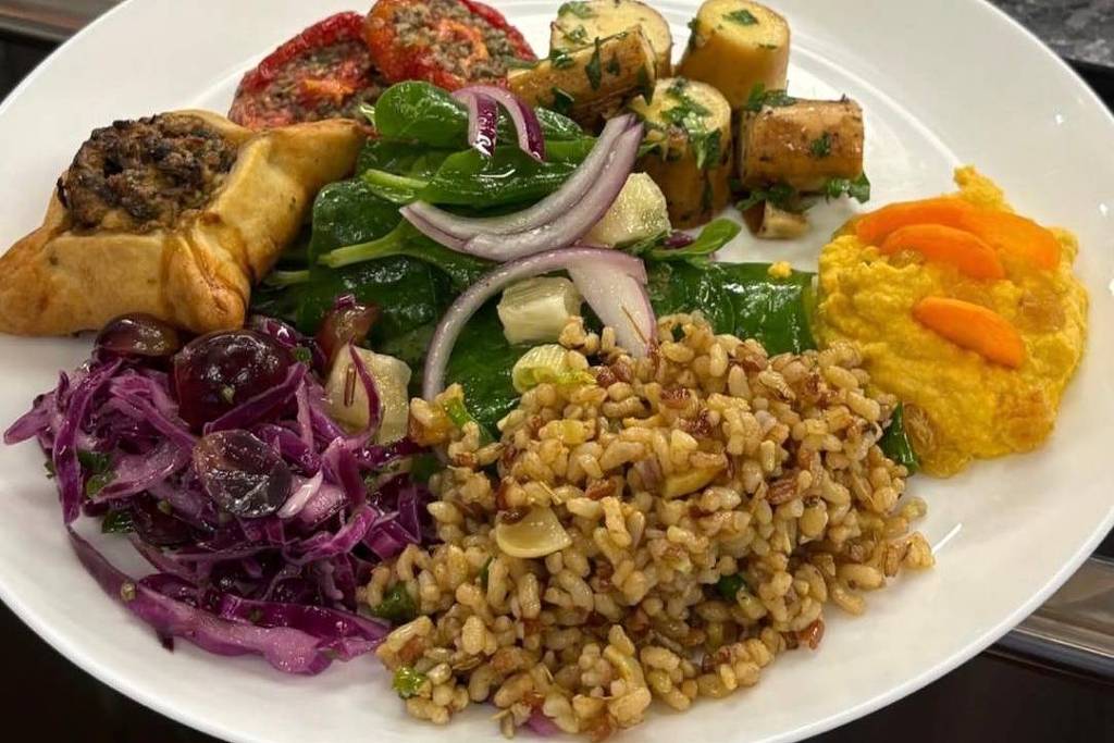 Prato branco com porções de salada de repolho roxo, espinafre com cebola roxa, trigo para quibe, purê amarelo com cenoura, quibe frito e legumes assados. Ao fundo, bandejas de buffet com diferentes pratos.