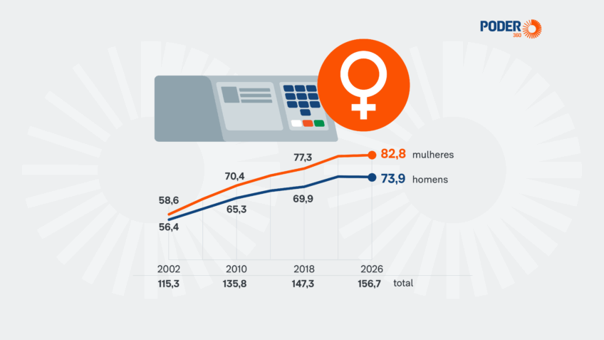 As eleições de 2026 caminham para ter um novo recorde de eleitoras mulheres. Dados do TSE (Tribunal Superior Eleitoral) de março mostram que as votantes habilitadas do sexo feminino são 52,8% do total. Em 2002, eram 50,8%. Houve uma alta de 2 pontos percentuais no período. Na comparação com 2022, o crescimento foi de 0,2 ponto percentual.