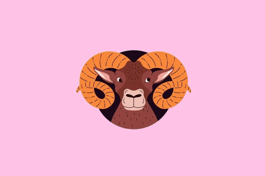 Ilustração frontal da cabeça de um carneiro marrom com grandes chifres curvados em tons de laranja e bege, em um fundo rosa