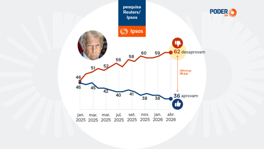 A taxa de aprovação do presidente norte-americano, Donald Trump (Partido Republicano) segue no nível mais baixo de seu mandato, 36%, mesmo patamar do mês anterior. Os dados são de pesquisa Reuters/Ipsos divulgada nesta 3ª feira (21.abr.2026). Eis a íntegra (PDF – 8,2 kB).