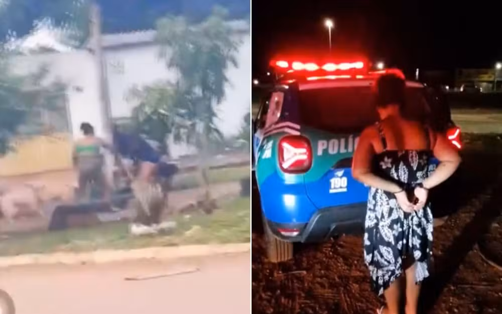 As imagens divulgadas pela Polícia Militar mostram o instante em que a vítima é derrubada e atacada enquanto está caída no chão. Na gravação, outra mulher também aparece participando das agressões, enquanto um homem acompanha a cena sem impedir o ataque.